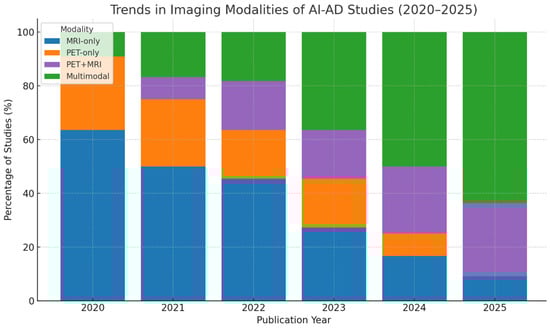 Modality trends in AI-based AD imaging studies from 2020 to 2025. This bar chart demonstrates the proportion of the studies utilizing MRI-only, PET-only, combined PET + MRI, and broader multimodal approaches (e.g., PET + MRI + clinical or CSF biomarkers). A progressive shift toward multimodal integration is evident, particularly after 2022, reflecting increased emphasis on combining structural, metabolic, and clinical information in predictive modeling.