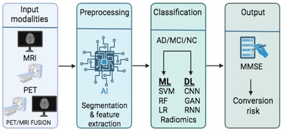 The AI pipeline in AD neuroimaging is presented in this figure. Preprocessing, including segmentation and feature extraction, is critical for forming raw MRI/PET data into meaningful inputs for further analysis using ML and DL tools. Accurate classification supports clinical outcomes by predicting cognitive decline (MMSE) and estimating conversion risk.