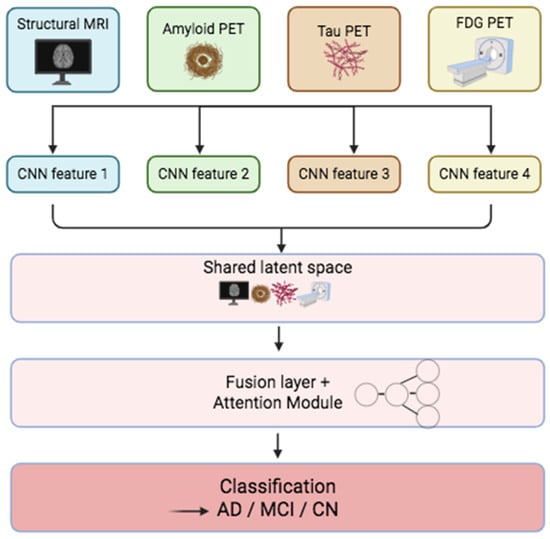 Multimodal fusion in AD diagnosis combines data from multiple sources such as MRI, PET, cerebrospinal fluid (CSF) biomarkers, and cognitive scores to improve diagnostic accuracy, staging, and prognosis [24] (Figure 5). Each modality analyzes different biological substrates of AD, with MRI providing detailed information on anatomy and FDG-PET reflecting glucose metabolism [25]. In addition, amyloid and tau PET visualize pathological deposition patterns. The complementary nature of these modalities frequently outperforms unimodal models, especially in detecting early stages of dementia and predicting disease progression [94,95].