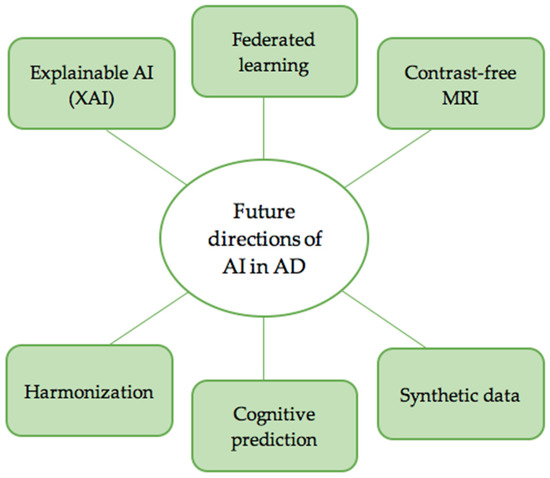 Emerging directions in AI for Alzheimer’s disease include explainable AI (XAI), contrast-free imaging, federated learning, harmonization, cognitive prediction, and the use of synthetic data via GANs, all of which aim to enhance clinical applicability, generalizability, and interpretability.