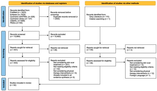 Given that the primary intended audience of this review includes clinicians such as physiotherapists involved in scar management, we emphasized dosage, application parameters, and clinical implications to support evidence-based decision-making in daily practice, while still providing sufficient methodological detail for research purposes. Therefore, the present scoping review aims to identify and map the available evidence and analyze knowledge gaps on this topic as a precursor for future research [10]. In particular, we aimed to provide a comprehensive overview of all studies addressing physiotherapy and non-invasive interventions for skin scar management.
