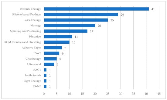 Pressure therapy was the most reported intervention (n = 41, 44.1%) [17,20,21,22,23,24,25,26,27,28,67,68,69,70,71,72,73,74,75,76,77,78,79,80,81,82,83,84,85,86,87,88,89,90,91,92,93,94,95,96,97]. Pressure values ranged from five to 50 mmHg, and the wearing time ranged between 30 min and 24 h a day; treatment duration lasted from three to 18 months. Nine studies considered the patient’s adherence and treatment complications [17,71,73,83,85,86,87,91,96].