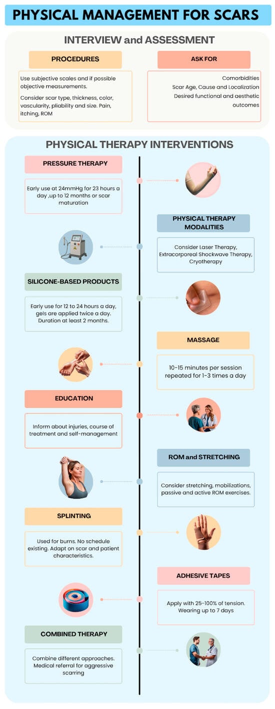 Scar-related impairments affect approximately 100 million individuals every year in high-income countries [1]; of these, around 11 million will develop keloids [2]. In low- and middle-income countries, scars also represent a substantial burden, with limited access to specialized care and rehabilitation services contributing to worse functional outcomes, greater disability, and socioeconomic impact [3]. Scar occurrence and irritation are frequently attributed to trauma, burns, surgery, vaccination, skin piercing, acne, and herpes zoster. Additionally, these conditions are often accompanied by intermittent pain, persistent itching, and a feeling of constriction [4]. Under normal circumstances, an immature scar undergoes a maturation process that may last several months. However, the maturation process may be compromised as the inflammatory process continues within the scar. As a result, the immature stage is prolonged, potentially resulting in pathological scars such as keloids and hypertrophic scars (HS) [5]. Mechanical forces, genetics, lifestyle choices, hormonal factors like estrogen, and conditions such as hypertension and pregnancy may contribute to the development of pathological scars [5]. Pathological scars are mainly divided into keloids and HS and have been observed to be associated with negative physical and psychological consequences such as scar contracture, a limited range of motion, increased pain, itching, anxiety, and a decreased quality of life [6,7]. Although growing evidence highlights their impact on quality of life, the burden of scars is an inadequately addressed topic, and most available studies focus on pharmacological or surgical approaches. Recent studies on scar management have highlighted the positive role that physical interventions may play in scar care. However, an overview of the various interventions is still needed. Two previous systematic reviews [8,9] found the positive effects of massage, lotions, silicone, splinting/casting, and modalities (e.g., extracorporeal shockwave therapy), but neither included common interventions such as patient education, manual therapy, or exercise. Thus, the heterogeneity among protocols adopted in clinical trials limits the generalizability of results.