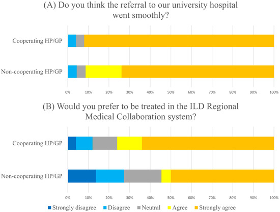 Patient Questionnaire on Interstitial Lung Disease Regional Medical Collaboration. (A) Do you think the referral to our university hospital went smoothly? Strongly agree and agree in the patients from cooperating HP/GP was 91.3%, and from non-cooperating HP/GP was 92.0% (p = 0.368). (B) Would you prefer to be treated in the ILD Regional Medical Collaboration system? Strongly agree and agree in the patients from cooperating HP/GP was 76.0%, and from non-cooperating HP/GP was 54.5% (p = 0.136).