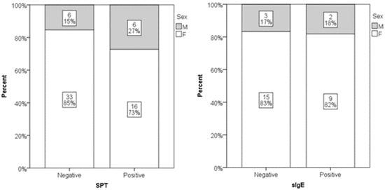 Distribution of genders in positive and negative SPT (p = 0.586) and sIgE subjects (p = 0.228). Relative numbers and percentages are presented.