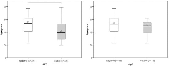 Age distribution in positive and negative SPT groups (p = 0.008) and sIgE groups (p = 0.334). Median value of age is presented numerically.
