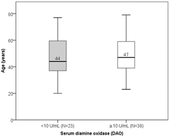 Distribution of age according to DAO levels (p = 0.806). Median value of age is presented numerically.