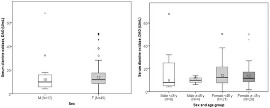 Comparison of DAO levels between males and females (p = 0.238) and sex–age combination (p = 0.695). The median value of DAO is presented numerically.