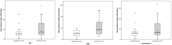 DAO levels did not significantly differ between groups with positive versus negative SPT or sIgE results. However, a slight (non-significant) increase in median DAO concentration was observed in patients with positive sIgE results (Figure 5).