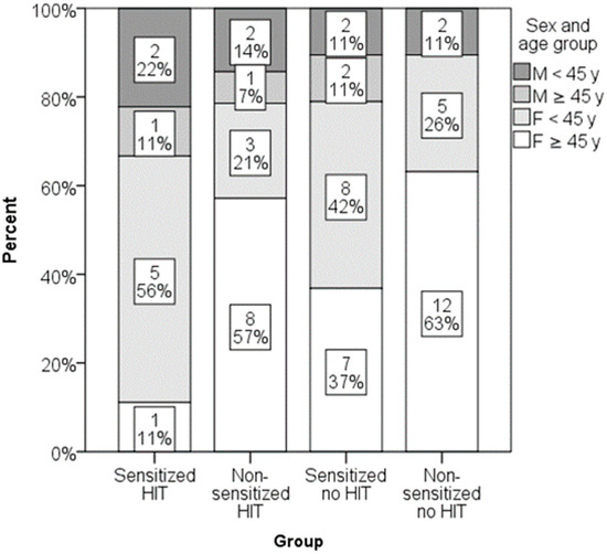 Low DAO levels were found in 16 out of 39 participants (41%) with negative SPT results and 7 out of 22 participants (32%) with positive SPT results. The difference was not statistically significant. Similarly, low DAO levels were found in 9 out of 18 participants (50%) with negative sIgE and 3 out of 11 participants (27%) with positive sIgE. Again, this difference was not statistically significant. When patients with either positive SPT or positive sIgE were merged in one group of sensitized patients and DAO levels were compared, no significant differences were found (Figure 5). Totals of 32% (9/28) of sensitized patients and 42% (14/33) of non-sensitized patients had histamine intolerance. Sex–age distribution in groups is presented in Figure 6. Some groups had a low number of participants, and differences did not reach the level of statistical significance.