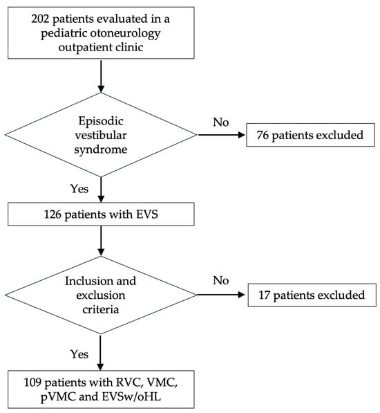We evaluated 202 children and adolescents with dizziness, vertigo, or unsteadiness. The mean age of the patients was 11.164 3.681 years, and 121 (59.9%) were females. We identified 126 patients with pediatric EVS. Finally, 109 subjects were included in the study, with a mean age of 11.47 3.32 years, with 64 (58.72%) females (Figure 1). These patients were classified as having RVC (55, 50.46%), VMC (23, 21.1%), pVMC (13, 11.93%), or EVSw/oHL (18, 16.51%).