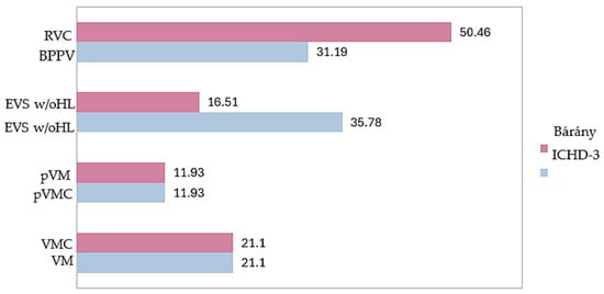 All the patients diagnosed with BPV according to the ICHD-3 criteria met the 2021 Bárány criteria for RVC. All patients diagnosed with VM and pVM were classified as having VMC and pVMC, respectively, according to the new criteria. In addition, 21 (19.27%) children initially diagnosed with EVSw/oHL were re-categorized as having RVC; therefore, the number of patients in the undetermined group was reduced from 35.78% to 16.51% (Figure 2).