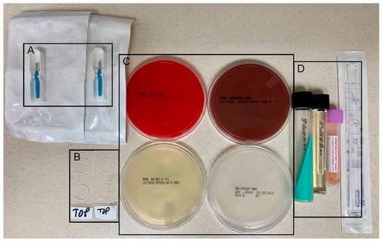 Corneal culture supplies. (A) #69 mini-blades for corneal scrapings. (B) Two microbiology slides, one for Gram stain (bacteria) and another for potassium hydroxide (KOH) stain (fungi). (C) Blood agar (top left, most bacteria), chocolate agar (top right, most bacteria, including fastidious respiratory bacteria, and most fungi), potato flake agar (bottom left, fungi), and non-nutrient agar (bottom right, acanthamoeba) plates. (D) Löwenstein–Jensen medium (left, mycobacteria), thioglycolate broth (middle, aerobic versus anaerobic microbes), and universal transport medium with flocked swab (right, viruses and chlamydia).