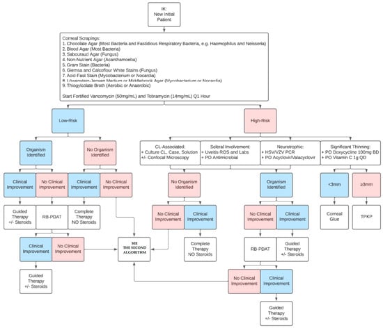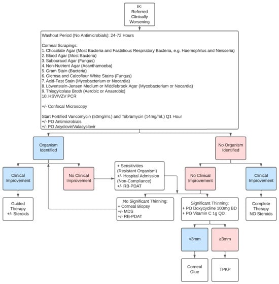 Figure 2 shows the BPEI algorithm for approaching a new IK patient. Based on our experience, corneal cultures are recommended for all cases of IK, regardless of disease stage. For patients with high-risk IK features, including contact lens wear, scleral involvement, neurotrophic keratopathy, and corneal thinning, we recommend additional measures. In contact-lens-wearing IK patients, the contact lens, case, and solution should be obtained and cultured. The contact lens should be placed on the chocolate agar plate for the microbiologist to mince. In cases of scleral involvement, a uveitis review of systems and lab workup is warranted. This includes infectious causes for scleritis, including tuberculosis (PPD/QuantiFERON-TB Gold), syphilis (RPR/FTA-ABS), and Lyme disease, and non-infectious causes for scleritis, including rheumatoid arthritis (ANA, RF, anti-CCP), granulomatosis with polyangiitis (ANCA), sarcoidosis (chest X-ray, ACE, lysozyme), and non-specific inflammation (CBC, ESR, CRP). Corneal sensation should be checked in all new IK patients prior to instilling any eye anesthetic drops in the clinic. If the patient is neurotrophic, we consider checking HSV/VZV PCR and starting the patient on treatment dose oral valacyclovir (1 g three times a day, renally adjusted if needed). For patients with corneal thinning from active tissue melting, oral doxycycline and vitamin C are used to suppress corneal collagenase and matrix metalloproteinase (MMP) activity. We have a low threshold to use cyanoacrylate glue given its globe-stabilizing and antimicrobial properties [21]. If therapeutic penetrating keratoplasty (TPK) is needed, the host corneal tissue should be sent for both microbiology (on chocolate agar plate) and pathology. To avoid the need for large-diameter TPKs and fresh donor corneal tissue, corneal patch grafting using irradiated corneal tissue can be a viable option, especially for peripheral IK [22]. Similarly, conjunctival pedicle flaps may be considered for peripheral IK, such as cataract wound infection [23]. In cases where no organism is identified, we do not recommend the addition of topical corticosteroids, given concern for atypical organisms like fungus, nocardia, or acanthamoeba. In cases of non-nocardia bacterial IK, however, we do recommend adding topical corticosteroids [24]. If the organism is identified but the patient is clinically worsening, RB-PDAT is considered.