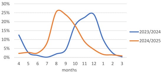 Percentage of hospitalized patients in individual months out of the total number in the 2023/2024 and 2024/2025 seasons.