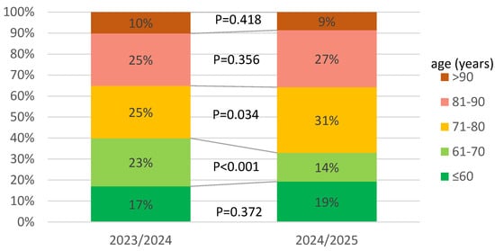 Age distribution of patients hospitalized in 2023/2024 and 2024/2025.