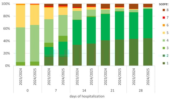 As shown in Figure 3, in the 2024/2025 season, after the first week of hospitalization, 81.9% of patients did not require oxygen therapy (score 1–4), while in the 2023/2024 season, this percentage was 75.1% (p = 0.011). At the same time, 38.9% (140/360) and 30.3% (218/719; p = 0.005) did not require hospitalization (score 1–2), respectively. In the following weeks of observation, these differences continued to be in favor of the 2024/2025 season (Figure 3).