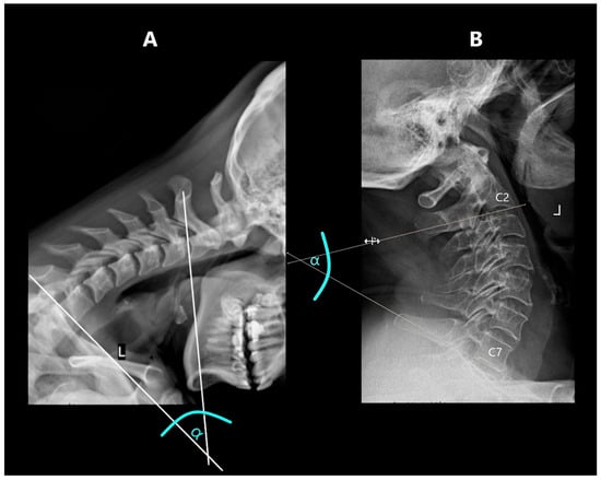 The Cobb angle was determined as the angle between two straight lines drawn tangentially to the lower edge of the C2 and C7 (Figure 1) [9,10]. Where the lower edge of C7 was not visible in the examination, due to the patient’s inability to take the required position, a C2–C6 substitute measurement with comparable diagnostic value was made [11]. Where the lower edge of the C6 vertebra was also unavailable, the measurements were abandoned (a total of 13 examinations in 11 patients). After taking measurements in functional projections, the sum of the obtained values was also calculated.