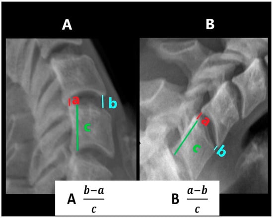 The cervical segmental curvature index was defined as the difference between the heights in the anterior and posterior parts of a particular intervertebral space in relation to the height of the lower vertebral body, which was measured in its posterior part (Figure 4). In flexion, the difference between the sizes of the posterior and anterior parts was counted, while in extension, the size of the posterior part was subtracted from the size of the anterior part [6].