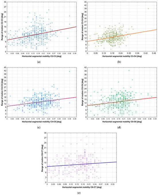 While the greatest mobility was noted in the C4–C5 segment, this was followed by the adjacent levels, i.e., C3–C4 and C5–C6, with the least mobility being observed in the marginal segments C2–C3 and C6–C7. This may result from the fact that the region C3–C6, i.e., around the center of the cervical spine, has the greatest activity. This would have a direct impact on the number of overloads and injuries in this area; these tend to accumulate with age, and indeed, the mean and median ROM values were found to gradually decrease in older age groups. Our data also indicate positive correlations between HDI and ROM at most levels of the cervical spine; however, no such relationships were demonstrated by Alizada et al. [6].