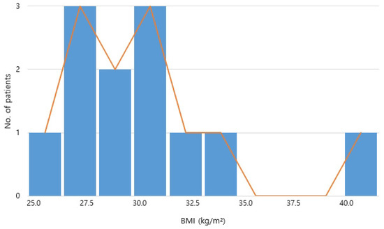 Eight patients had a prior diagnosis of hypertension, six had diabetes mellitus, and nine had elevated lipid profiles. Abnormal liver function test results were present in eight patients. Ten patients were classified as obese based on the World Health Organization (WHO) Asia–Pacific Body Mass Index (BMI) criteria, with a mean BMI of 30.15 ± 4.59 kg/m2 (Table 1). BMIs ranged from 25.0 to 40.2 kg/m2, with most patients falling within the overweight or obese range (Figure 1).