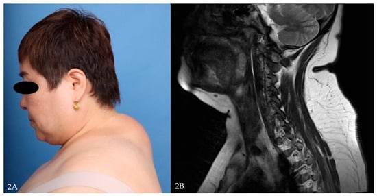(A) Preoperative clinical photograph showing prominent buffalo hump. (B) Sagittal T2-weighted MRI demonstrating diffuse subcutaneous fat accumulation in the cervicodorsal region.