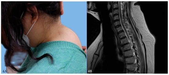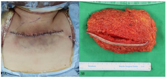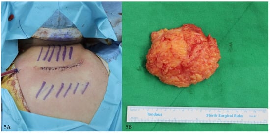 A 60-year-old female with no prior chronic illness presented with progressive fat accumulation in the cervicodorsal region. Workup revealed elevated liver enzymes, a fasting glucose of 144 mg/dL, and total cholesterol of 271 mg/dL. She was subsequently diagnosed with type 2 diabetes and hyperlipidemia. Her BMI was 34.2 kg/m2. Surgical excision of the fat pad was performed without complications (Figure 2A,B and Figure 3A,B).