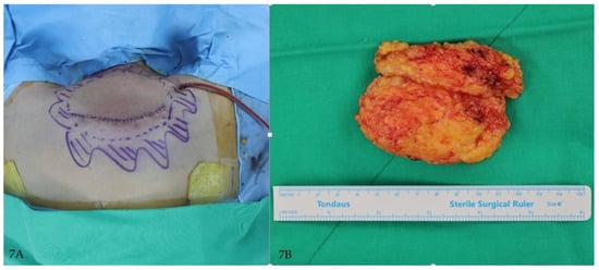 (A) Immediate postoperative photograph showing primary closure after excision. (B) Gross photograph of excised specimen consisting of adipose tissue with overlying fibrous septa.
