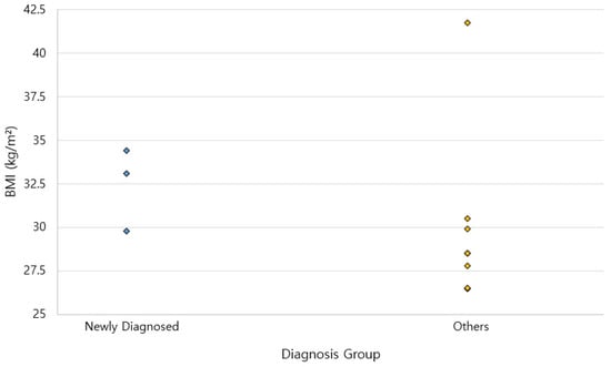 No significant differences were found between the newly diagnosed group and others in age (45.67 ± 21.46 vs. 60.67 ± 14.31 years, p = 0.194) or BMI (32.44 ± 2.39 vs. 29.39 ± 4.99 kg/m2, p = 0.145). Similarly, group differences were not statistically significant for the prevalence of hypertension, diabetes mellitus, hyperlipidemia, and liver dysfunction (all p > 0.49). In addition, there was no significant correlation between age and BMI (Spearman’s ρ = −0.158, p = 0.624) (Table 2). Newly diagnosed patients had a slightly higher average BMI, but the difference was not statistically significant (Figure 8). These results, however, must be interpreted with caution given the small sample size and lack of statistical power. Non-significant results in this context are inconclusive rather than evidence of no association. Although not statistically significant, the observed patterns may still suggest that cervicodorsal lipodystrophy reflects systemic disease burden, especially in obese individuals.
