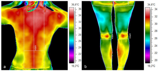 Thermal images of the pregnant woman in the 1st trimester, where (a) dorsal part, (b) posterior surface of the lower limbs with marked regions of interest.