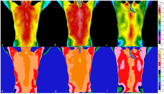 Comparison of thermal images in two color scales of the dorsal part taken in a female volunteer: (a,d) at 9 weeks of pregnancy—1st trimester, (b,e) at 22 weeks of pregnancy—2nd trimester, (c,f) at 40 weeks of pregnancy—3rd trimester. Images (a–c) are presented using the rainbow scale, while (d–f) are presented using the medical scale.
