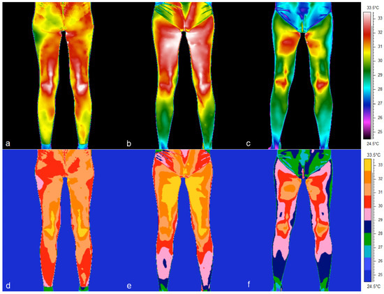 Comparison of thermograms in two color scales of the posterior surface of the lower limbs taken in a female volunteer: (a,d) at 9 weeks of pregnancy—1st trimester, (b,e) at 22 weeks of pregnancy—2nd trimester, (c,f) at 40 weeks of pregnancy—3rd trimester. Images (a–c) are presented on the rainbow scale, while (d–f) are presented on the medical scale.