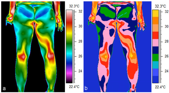 Comparison of thermograms in two color scales of the posterior surface of the lower limbs taken in the 3rd trimester of a female volunteer, where (a) rainbow scale, (b) medical scale.