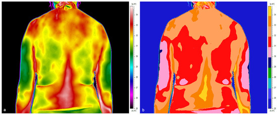 Thermal images presented in two color scales of the dorsal part taken in the 3rd trimester of a female volunteer, where (a) rainbow scale, (b) medical scale.