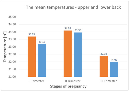 The analysis of the thermograms revealed asymmetries in the temperature distribution mostly within the lower limb region, which may indicate modifications in musculoskeletal and circulatory load. The most considerable fluctuations in body surface temperature were observed between the second and third trimesters of pregnancy, in areas exhibiting a high physiological load, including the upper back (1.85 °C), lower back (1.95 °C), thighs (1.73 °C) and calves (1.14 °C).