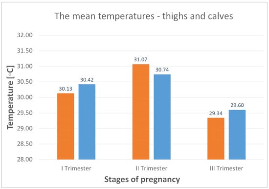 The mean temperatures recorded for the thighs (orange) and calves (blue) during the first, second and third trimesters.