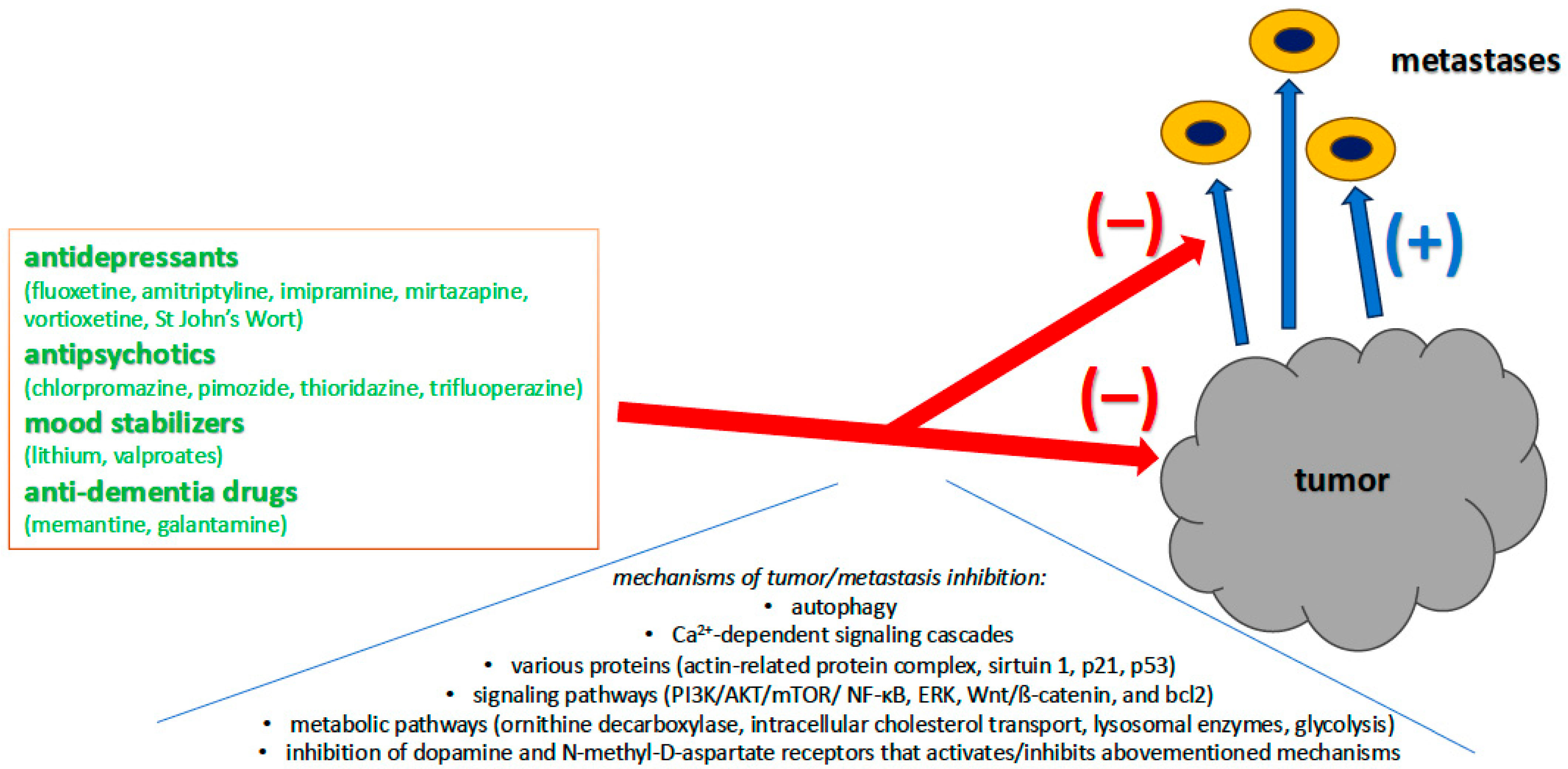 - Fond, G.; Macgregor, A.; Attal, J.; Larue, A.; Brittner, M.; Ducasse, D.; Capdevielle, D. Antipsychotic drugs: Pro-cancer or anti-cancer? A systematic review. Med. Hypotheses 2012, 79, 38–42. [Google Scholar] [CrossRef]