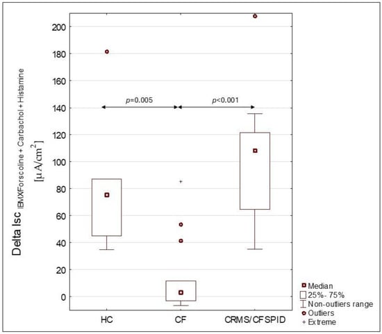 Differences in ΔISCIBMX/forskolin+Carbachol+Histamine for groups HC (healthy controls group), CF (cystic fibrosis patients group) and CRMS/CFSPID (cystic fibrosis transmembrane conductance regulator-related metabolic syndrome/cystic fibrosis screen positive, inconclusive diagnosis patients).