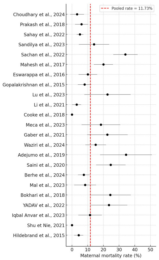 Overall, 25 studies were included in this systematic review, including 2328 women who underwent PRAKI, of whom 273 died. The crude pooled analysis of the included studies revealed an overall maternal mortality rate of 11.73% (273/2328), ranging from 0% to 34.4%. In addition, fetal outcomes involved 646 IUDs and stillbirths. The perinatal mortality rate was 27.57% (646/2343), ranging from 2.7% to 60%. The results are summarized in Figure 2 and Figure 3, respectively.