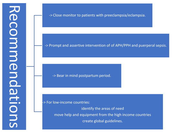 PRAKI may result in a fetal condition associated with negative maternal and perinatal outcomes. The primary etiologies of PRAKI, such as puerperal sepsis and PPH, are both treatable and preventable. Furthermore, prompt and assertive management of APH/PPH and puerperal sepsis is essential to mitigate the incidence of PRAKI in developing nations [42]. Figure 4 presents brief recommendations for mitigating the impact of PRAKI.