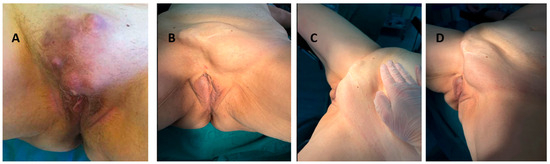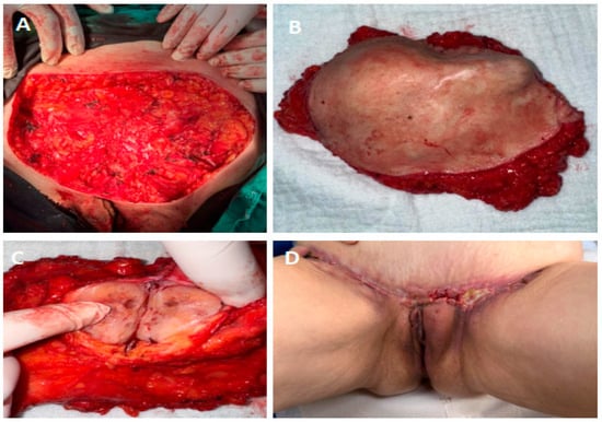 Initial diagnosis and treatment in 2020, a 74-year-old postmenopausal white woman, with no significant comorbidities other than arterial hypertension and a prior cholecystectomy (2006), presented with a painful, enlarging mass of the mons pubis, measuring 10 cm in diameter (Figure 1A) [3]. She reported severe pain, partially relieved by analgesics, but denied vaginal bleeding or discharge [3].