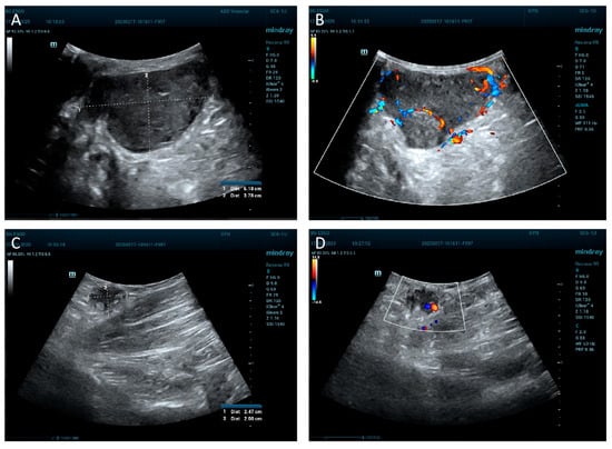The ultrasound image shows a well-defined structure with dimensions of approximately 6.18 cm in length and 3.78 cm in width. It appears as a relatively hypoechoic area, darker than the surrounding tissue (Figure 2A). The lymph node ultrasound image reveals a small, well-defined structure measuring approximately 2.47 cm in length and 2.00 cm in width, consistent with an enlarged lymph node. The node is relatively hypoechoic and oval in shape, suggesting a reactive or possibly pathological nature (Figure 2C). A Doppler ultrasound was also performed to further assess vascular characteristics of the tumor formation (Figure 2B) and the lymph node (Figure 2D).