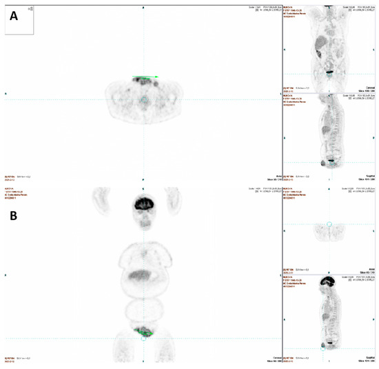 (A) PET-CT axial section. (B) PET-CT coronal section.