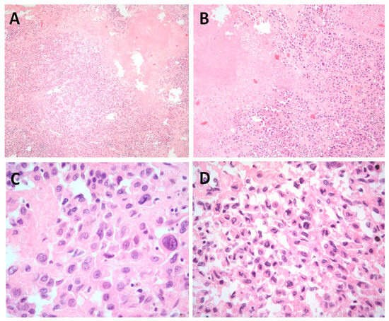 (A) HE, 4×—Cellular tumor with evidence of tumor necrosis and cellular pleomorphism. (B) HE, 10×—Cellular tumor with evidence of tumor necrosis and cellular pleomorphism, scant lymphocytic infiltrate can be noticed. (C) HE 40×—Significant pleomorphism and cellular atypia can be noted. (D) HE 40×—Significant pleomorphism and cellular atypia are observed, single mitoses are evident.