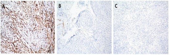 (A) Alpha SMA, 100×. (B) Desmin, 100×. (C) Myo-D1, 100×.