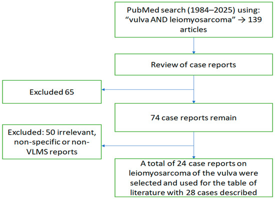 A literature search was performed to provide an overview of all the cases and case characteristics of VLMS described in the literature. We conducted a search in the PubMed® database from the years 1984 to 2025 for the terms “vulva AND leiomyosarcoma”. This yielded a total of 139 citations. Based on the article type filter-case report, we excluded 65 of them. Of the remaining 74, only 24 meeting the criteria. Thus, a total of 24 publications on LMS of the vulva were taken into account to use for the discussion and review of literature, including the table of literature (Figure 7).