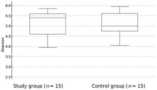 There was no statistically significant difference between overall biological diversity—described as Shannon index (p = 0.92) (Figure 1) and Bray-Curtis distance (p = 0.57)—(Figure 2) between study and control groups. At the taxonomic level, no statistically significant differences in the microbiome composition were observed, although the proportion of Firmictutes to Bacteroidetes was shifted toward Firmicutes in both subgroups.