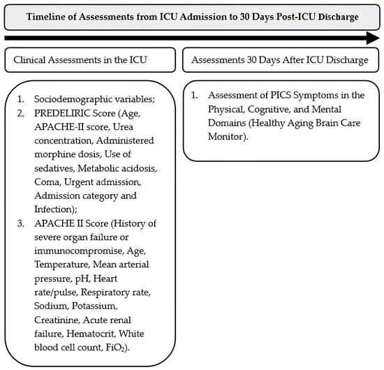 This study was conducted in two phases. In the first phase, information on variables and predictors (Section 2.3) was collected, including assessments of the PREDELIRIC and APACHE II scores. Subsequently, one month after discharge from the ICU, patients were assessed for PICS symptoms using the Healthy Aging Brain Care Monitor (Figure 1).