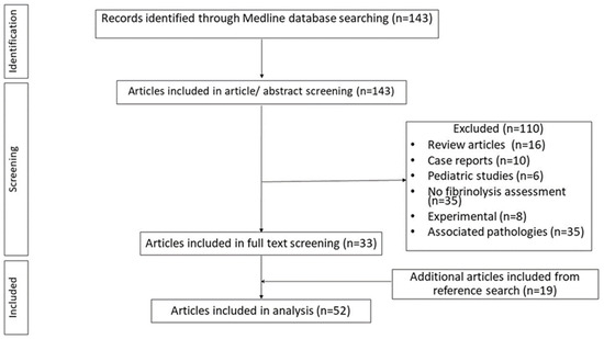 Search strategy retrieved 143 articles, from which only 33 were included. The remaining 110 articles were excluded for the following reasons: 35 articles did not assess fibrinolysis, 10 were case reports, 16 were reviews, 6 were pediatric studies, 8 were experimental, and 35 described patient populations having associated pathologies possible leading to fibrinolysis alterations (Figure 1). Additional eligible studies were identified by searching the reference lists of articles that were fully assessed. 19 additional articles were added from references, resulting in 52 articles included in our review (Figure 1). Table 1 summarizes the different techniques used to assess fibrinolytic activity in the research studies examined.