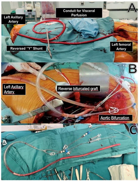 Intraoperative images of a passive shunt. (A): A passive shunt between the LAA and the LFA was created using an 8 mm Dacron prosthesis to provide blood flow for visceral perfusion during aortic cross-clamping through a side branch. (B): The picture shows a different configuration of PS in which an external bypass is created between the left axillary artery and the infrarenal aorta using a reversed bifurcated 8 mm Dacron graft. (C): Elemental circuit for PS: a 8 mm Dacron graft is connected with a “Y-bifurcated” line with two 9F Pruitt occlusion-perfusion balloon catheters for visceral vessels perfusion. The other end of the prosthetic graft will be anastomosed to an inflow vessel to assure perfusion during aortic cross-clamping.